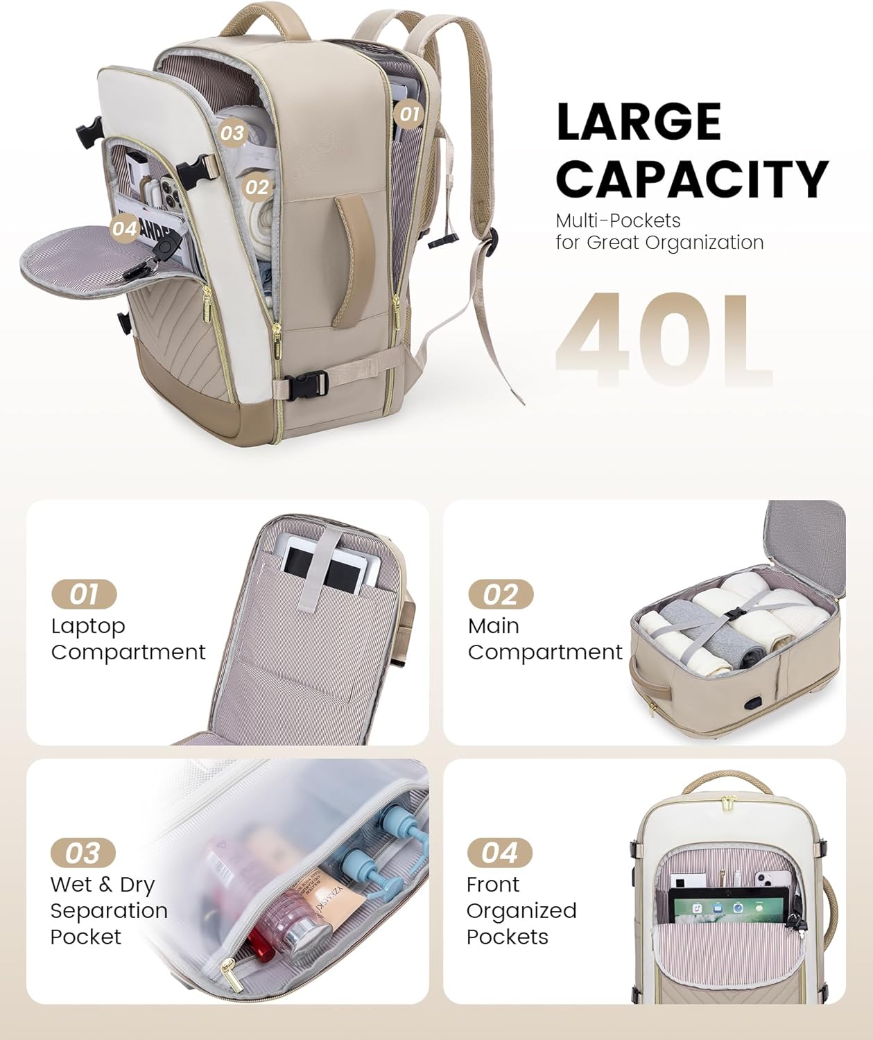 Large Travel Backpack for Women, TSA Carry on Backpack for Airplanes, 40L Personal Item Travel Bag for Women fits 17″ Laptop,Waterproof Carry on Bag Airplane Approved with 3 Packing Cubes